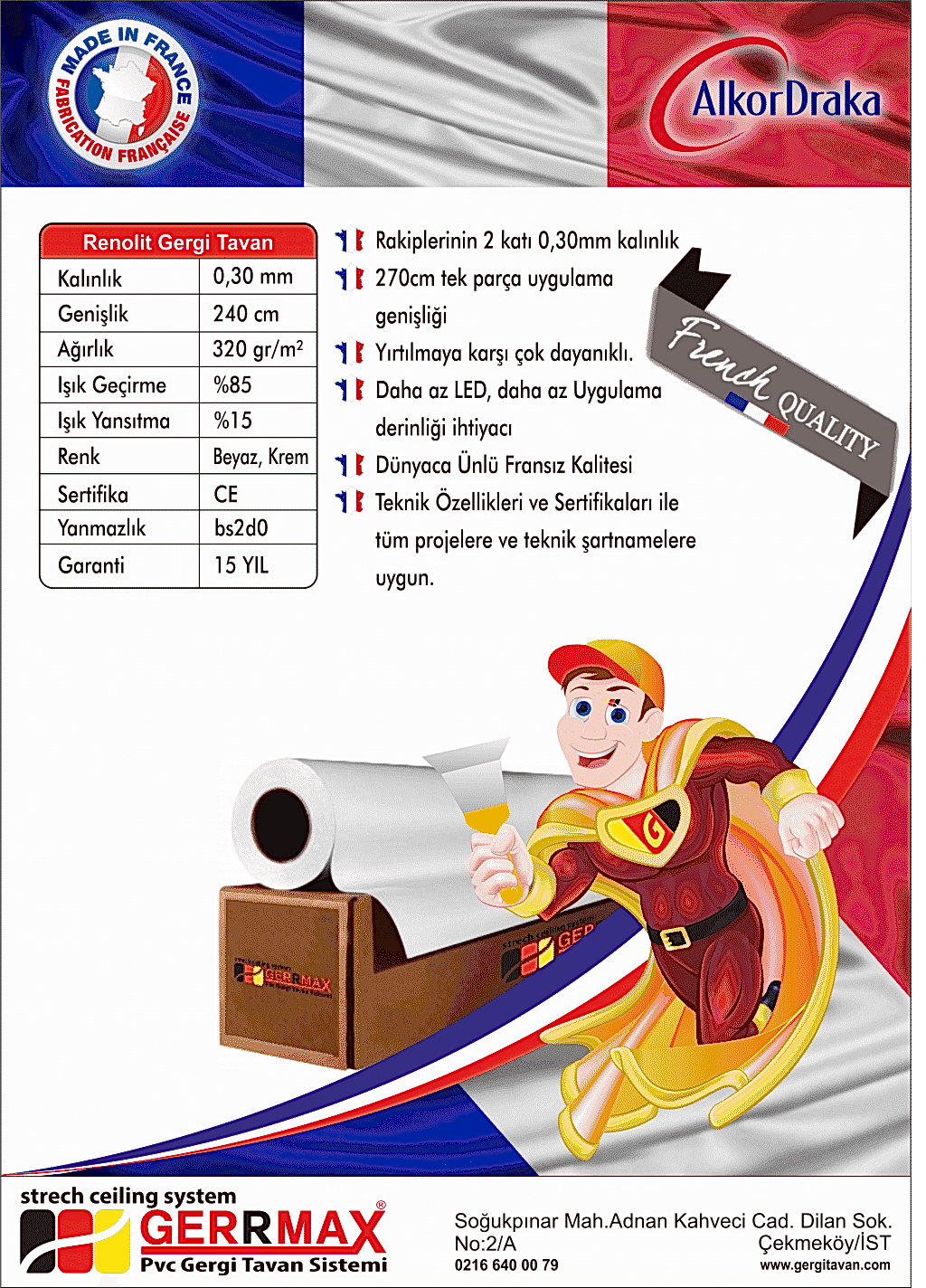 Dünyaca ünlü Fransız PVC membran üreticisi Alkor Draka tarafından üretilen Gergi Tavan ürünüdür.