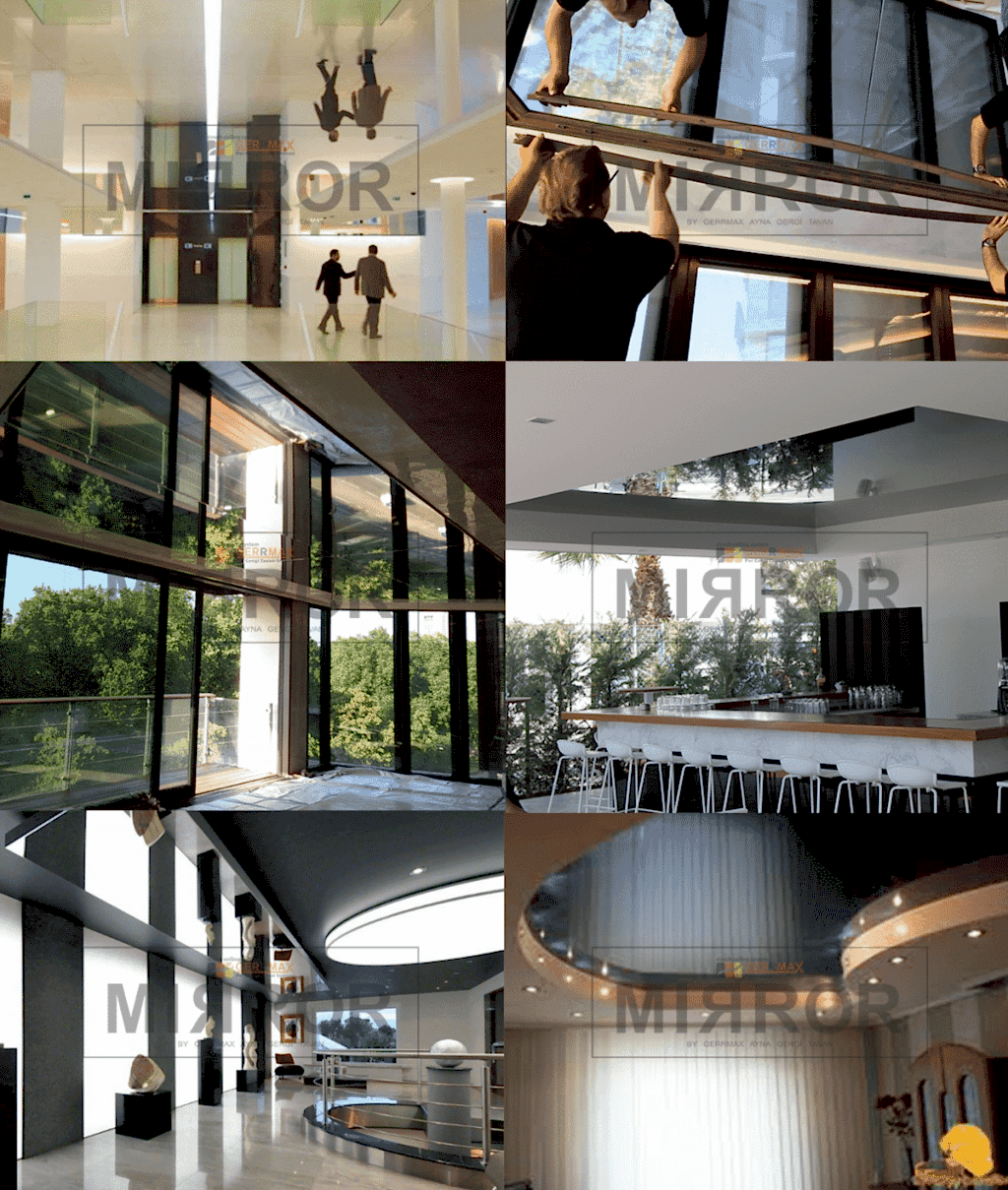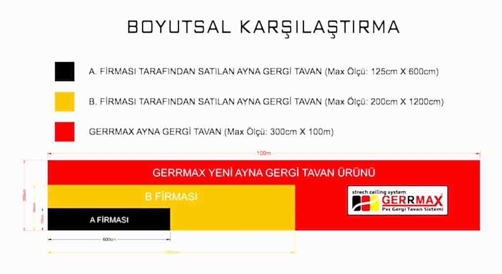 Hali hazırda pazarda satılmakta olan ve maksimum 125 x 600cm boyutlarda uygulanabilen düşük yansıma oranlı PVC Ayna Gergi Tavan ürünlerinin uygulama boyutlarını 3m x 100m gibi inanılmaz bir büyüklüğe çıkartıp, birim m² ağırlığını %50 azaltıyor, optik yansıtma değerlerini ise geleneksel cam aynaların çok daha üzerinde bir yansıtma ve parlaklık değerlerine taşıyarak, yapı sektöründe kullanılan Ayna Gergi Tavan uygulamalarını en üst seviyeye taşıyoruz. B s1 d0 Yanmazlık sınıfında üretilen Ayna Gergi Tavan ürünlerimiz, tüm projelerde kabul görmektedir.